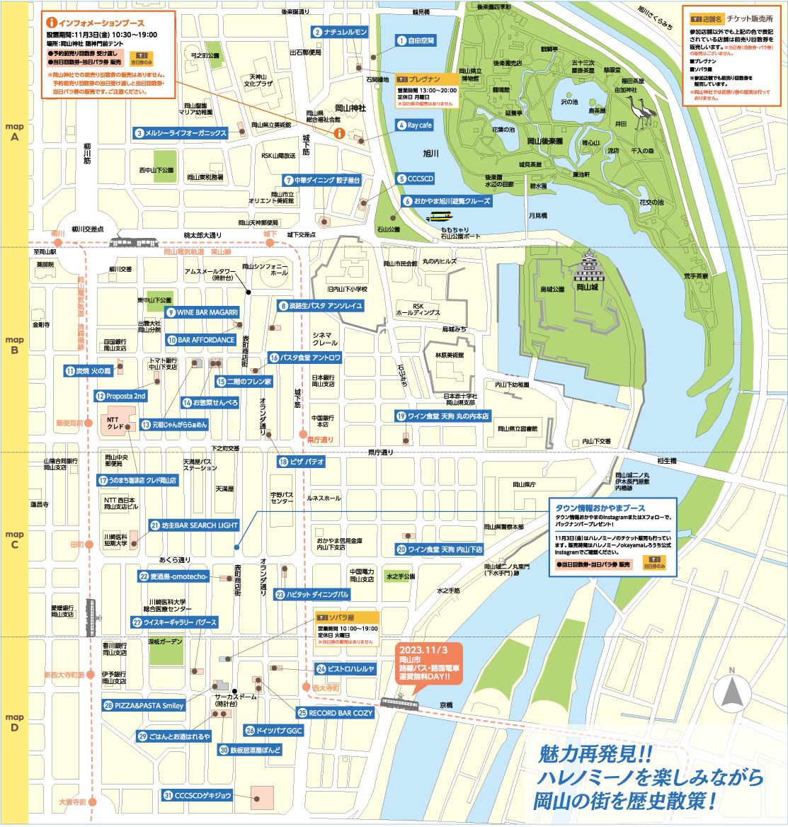 前売り回数券、当日回数券をご購入頂くと「第2回ハレノミーノokayamaしろうち」ガイドマップがついてきます。